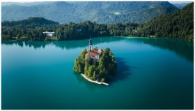 A breathtaking aerial view of Bled Island and its church in Slovenia, surrounded by vibrant blue waters.