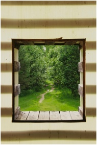 View through a rustic window frame into a vibrant green woodland path.