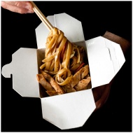 Close-up of hands holding a takeout box of spicy Asian noodles with chopsticks.