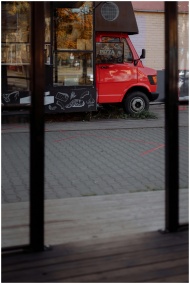 A vibrant red food truck with artistic chalkboard