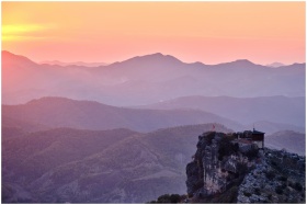 Breathtaking view of Petrelë Castle during sunset, nestled in the scenic Albanian mountains.