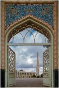 Intricate archway frames the splendid architecture of a mosque in Khaf, Iran.