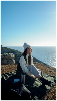 A woman sits by the ocean enjoying a peaceful sunset, wrapped in warm clothing.