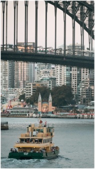 A ferry travels under the Sydney Harbour Bridge, w