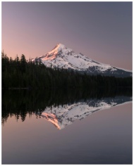 Serene sunrise over Mount Hood reflecting on a calm lake, capturing winter beauty and tranquility.