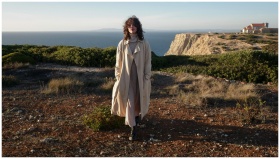 A woman in a beige coat stands by a cliff overlooking the ocean at sunset.