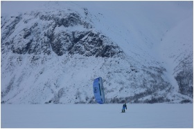 Person snowkiting against a snowy mountain backdrop in Kirovsk, Russia.