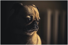 Detailed low light portrait of a pug dog with a th