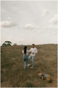 Man and woman dancing in a field with playful dog