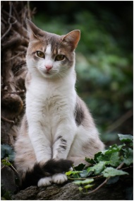 A beautiful cat sitting among lush ivy in a garden in Labin, Croatia.