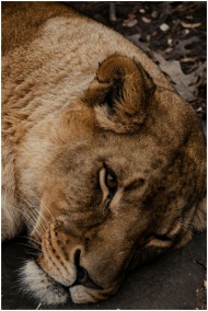 A serene close-up of a lioness resting outdoors, showcasing wildlife beauty.