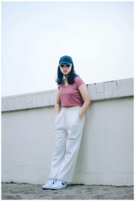 Fashionable woman in pink top and white pants leans on a wall, exuding a casual and confident vibe.