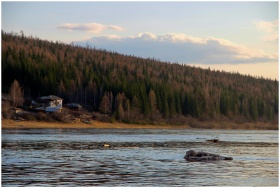Peaceful evening view of a river and pine forest near Irkutsk, Russia, ideal for nature lovers.