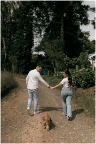 A couple strolls with a dog down a rustic path surrounded by lush trees.