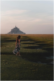 A woman in a floral dress walks towards Le Mont-Saint-Michel at sunset in the French countryside.