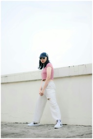 Fashionable woman wearing a crop top and white pants posing outdoors in Cimahi.