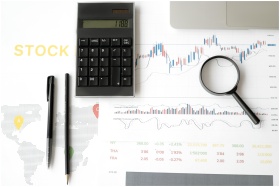 Flat lay of stock market analysis tools including calculator, graphs, and magnifying glass.