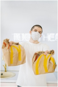 Man wearing a mask holds fast food bags indoors, emphasizing safety during pandemic.