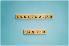 Wooden letter tiles spelling testicular cancer on a blue background, concept photo.