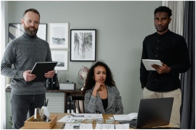 A diverse team of professionals collaborating in a modern office setting, planning and coordinating.