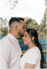 A couple sharing a tender moment with a kiss on the forehead in a serene outdoor setting.
