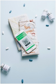 A high-angle shot of a smartphone displaying a health passport with COVID-19 QR code, surrounded by vaccine vials, pills, and travel documents.