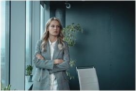 A professional businesswoman stands confidently in a modern office, exuding leadership and determination.