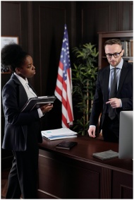 Two colleagues engaged in a discussion in a formal office setting with an American flag.