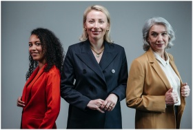 Three confident business women standing in fashionable attire, exuding professionalism.