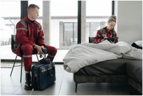 Two paramedics tend to a patient in a modern bedroom, highlighting emergency care services.
