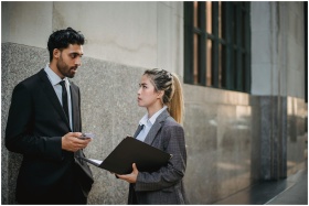 Two professionals in business attire discussing work outside an office building.