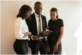 A team of professionals discussing work around a clipboard in an office setting.