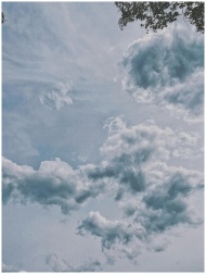 A tranquil image of a partly cloudy sky with wispy clouds and a hint of foliage.