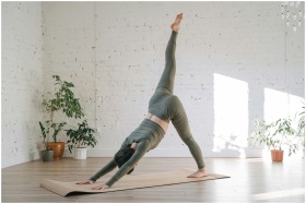 A woman performs a yoga pose on a mat in a sunlit room, promoting health and wellness.