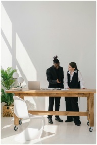 Two professionals engaged in discussion at a sleek