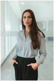 Businesswoman with brown hair in a striped shirt s