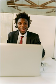 Young man working remotely on laptop in a stylish