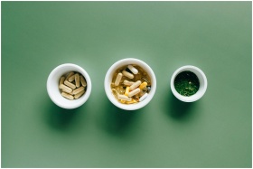 Top view of bowls with capsules, herbs, and supple