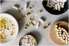 A variety of pills and capsules arranged on a grey surface, showcasing health and wellness.