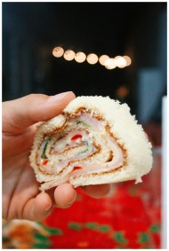 Close-up of a hand holding a rolled sandwich with festive bokeh lights in the background.