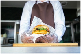 A chef in a food truck presents a gourmet burger wrapped in paper. Perfect for fast food or culinary themes.