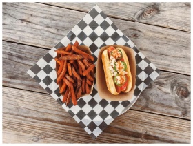 Flat lay of a gourmet hot dog with fresh toppings and sweet potato fries served on a rustic wooden table.