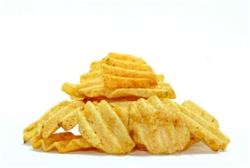 A close-up of crispy wavy potato chips stacked against a white background, highlighting their texture.