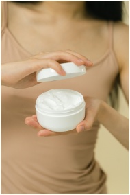 Close-up of a woman holding and opening a jar of cosmetic cream with soft focus.