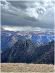 Epic view of rugged mountain range with dramatic clouds gathering.