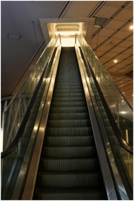 A dramatic upward view of an indoor escalator captured at night creating a sense of urban exploration.