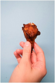 Close-up of a crispy fried chicken drumstick held