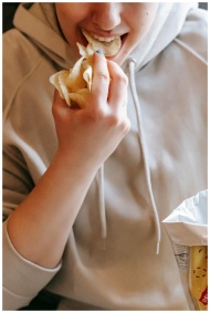 Crop female in comfy hoodie eating tasty savory potato chips in light room
