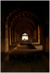 Intricate architectural arches inside the Red Fort in Delhi, India.