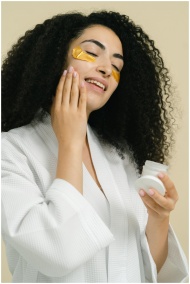 Smiling woman applies skincare product with gold eye patches, enjoying a self-care routine.